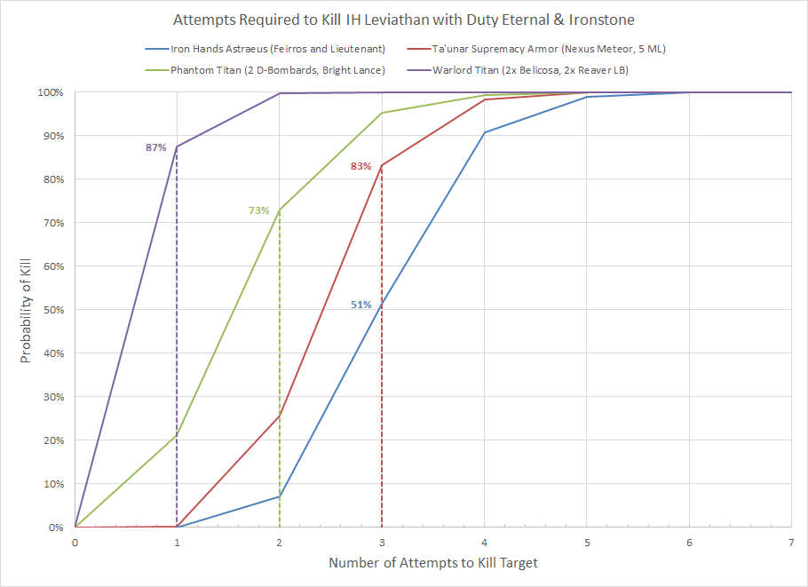 Probability distribution for the number of attacks required to kill an Iron Hands Leviathan Dreadnought with the Duty Eternal Stratagem and the Ironstone Relic. Holy shit the Warlord Titan might still fail.In spite of having Feirros and a Lieutenant, we see that the hilariously overcosted and undergunned Astraeus continues to be disappoint in Warhammer 40K. It's much better in Apocalypse, but here it will take three rounds of shooting to possibly kill the Leviathan half the time. The Ta'unar Supremacy Armor fares better, giving us an 82% chance of success after three rounds. The pinnacle of Eldar Resin Bullshit, the Phantom Titan, will likely need two rounds to kill the Leviathan despite being an order of magnitude more expensive. It turns out that your best bet for slaughtering the Relic Leviathan is a Warlord Titan. 6,000 points will get you an array of city-destroying firepower that, 13% of the time, still won't kill this stupid 14-wound walker.
