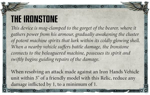 Credit: Games WorkshopSomething that does appeal to dreadnoughts though is the new Ironstone Relic. which allows nearby vehicles to reduce incoming damage by 1. Given how the 8th edition meta has shifted its focus hard toward Damage 2 guns and weapons, the Ironstone negates all the points being spent on doing that and in many cases, may double the longevity of a vehicle. It also (currently) pairs with the Duty Eternal Stratagem to reduce incoming damage for Dreadnoughts by one half. We expect GW to release an FAQ note on the order of operations for how these two interact in the next month, but for now we'll assume that they follow the standard mathematical order, i.e. that division happens before subtraction, and so an incoming attack doing 4 damage would be dropped to 2 by Duty Eternal, then to 1 by the Ironstone (as opposed to being dropped by 1 with the Ironstone first, then to 1.5 and rounded up to 2 by Duty Eternal).