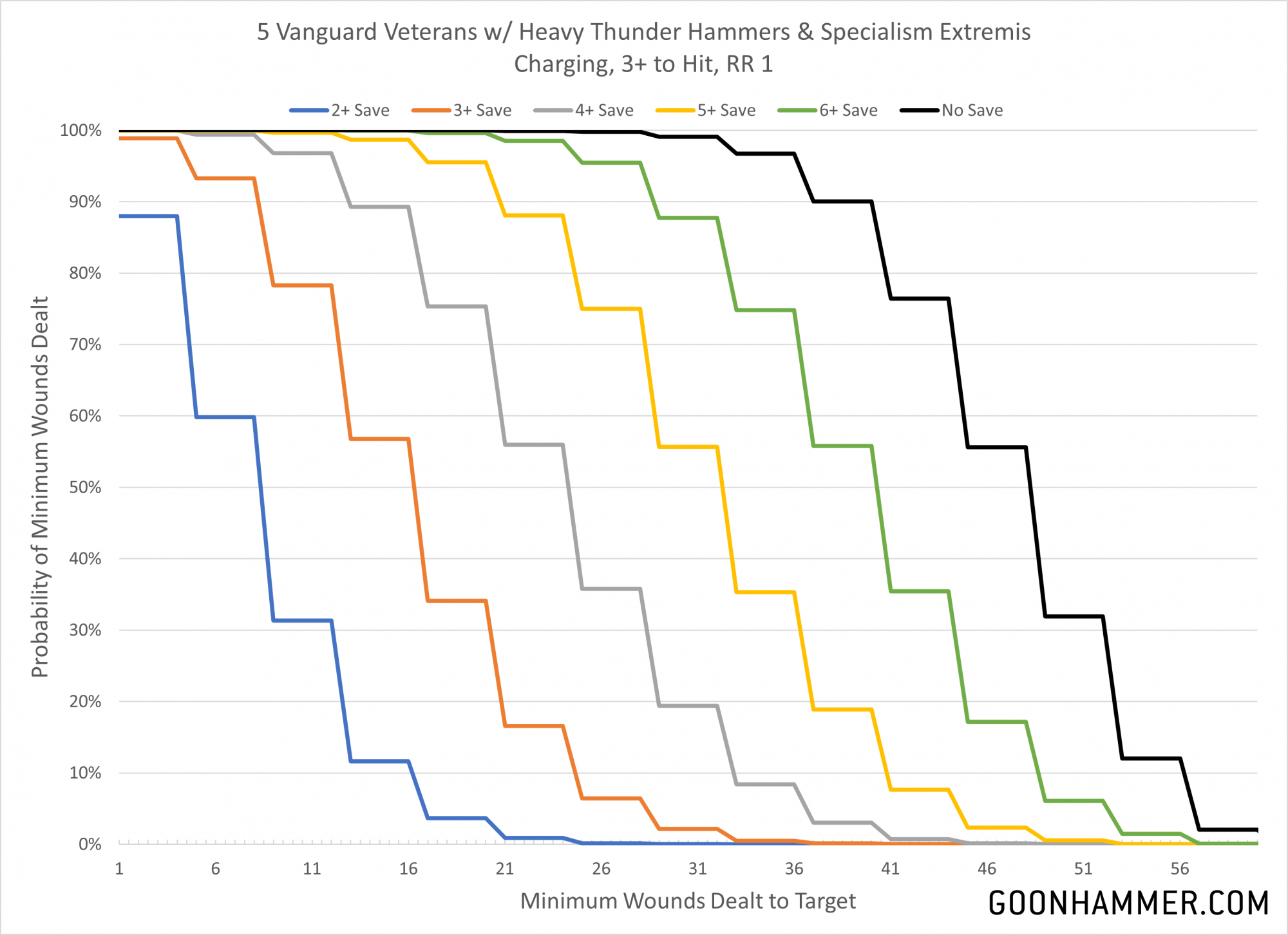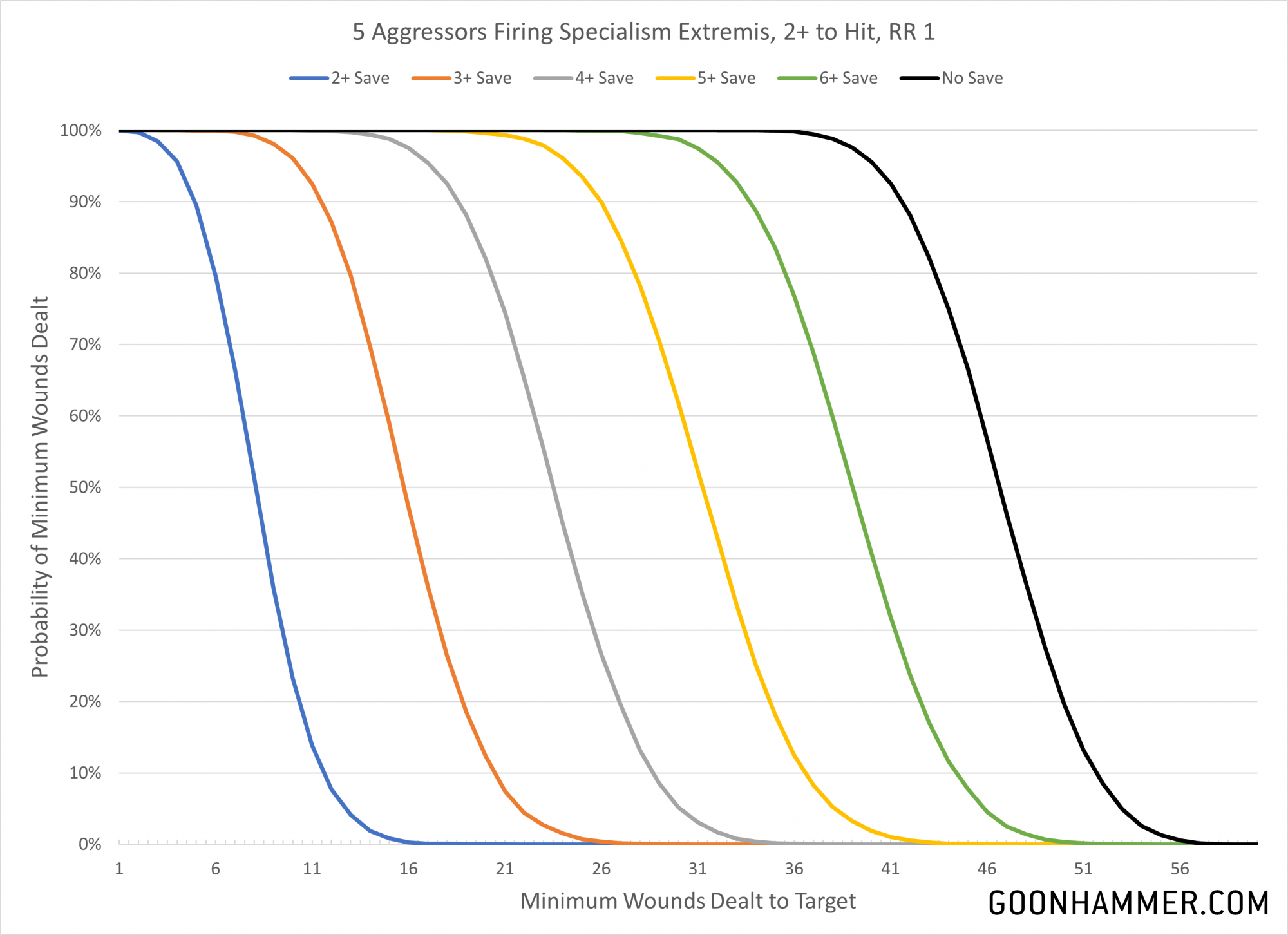 The two charts below put these numbers into effect. First up is 5 Aggressors firing with a 2+ to hit, re-rolling 1s. Each line represents a different save profile. As the saves get worse the numbers quickly become absurd, with the massive volume of rolls overwhelming nearly anything.