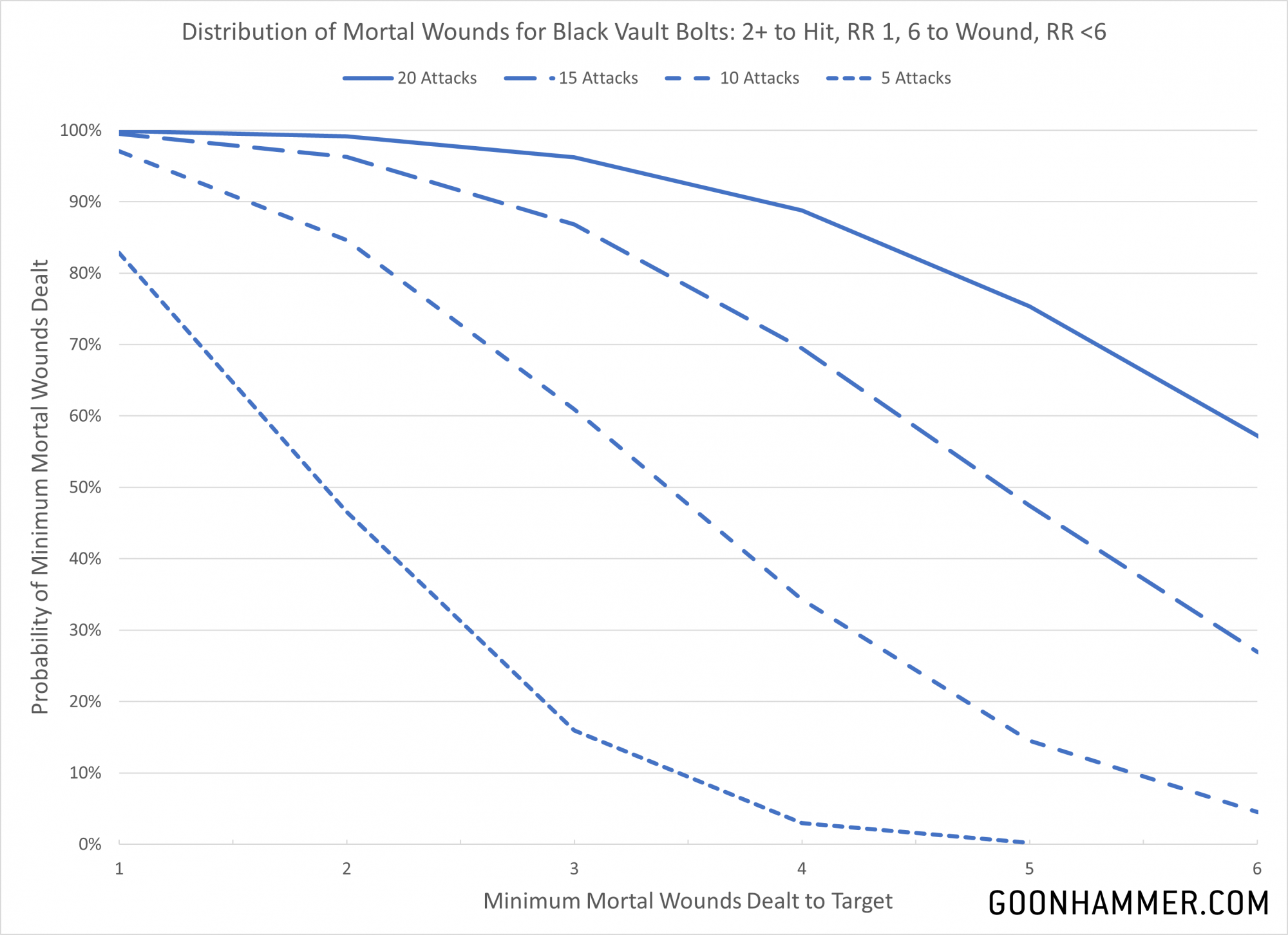For 1CP, Black Vault Bolts allows you to take a STRIKE FORCE KILL TEAM or STRIKE FORCE CHARACTER and apply two effects during the shooting phase. First, the Type characteristic of the weapons they're firing changes to Heavy 1. Second, on an unmodified wound roll of 6 the attack inflicts 1 mortal wound in addition to any normal damage. No matter what the maximum possible number of mortal wounds inflicted per phase is 6. This seems like a fairly difficult thing to achieve, but how realistic is it?