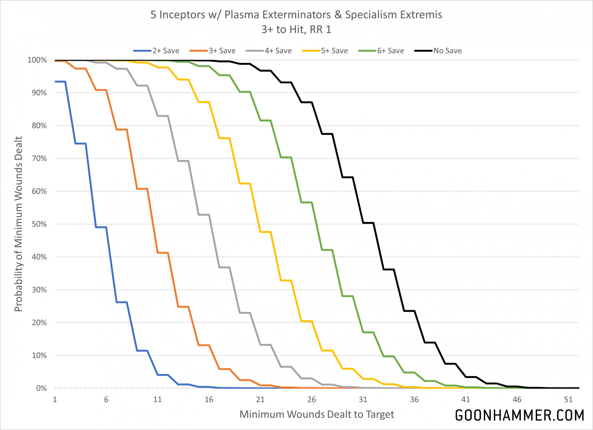 Finally we can take a look at something less boosted; 5 overcharging plasma Inceptors with no bonuses outside of re-rolling 1s to hit so that you aren't guaranteed to wipe out the squad with their own guns. With AP -3 or AP -4 this unit can kill a large number of targets even without the application of hit bonuses.