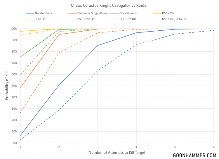 House Temporis Castigator. Credit - IG @samuel_fenwickThis request comes from reader David ‘Boaty’ Still, who wants to know what kind of damage a 460 point Khomentis Castigator can do to a Raider. The baseline attack with the castigator bolt cannon is 16 S6, AP -2, 2D shots. Khomentis Castigators have access to two powerful abilities. As an Infernal Household members of House Khomentis can drag themselves to the altar of their particular god and enable a Daemonic Surge to improve the Strength and Damage characteristics of a ranged weapon. All it costs is 1D3 wounds and your immortal soul. Khomentis Warlords can boost that even further with the Dread Hunter trait, which is a once per game ability that boosts the weapon Damage characteristic by 1, and also re-roll wound and hit rolls. The effect of these benefits are significant, providing a 95% chance of killing the Raider in a single attempt even with a penalty to the Hit roll.