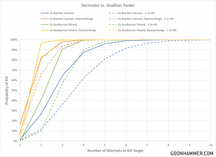 Credit: Robert "TheChirurgeon" JonesIn addition to being an absolutely gorgeous model, the Decimator is able to put out a world of hurt. A pair of butcher cannons will deal 8 S7, AP -2, D2 shots. As cool as that sounds, the soulburner petard is even nastier. A pair of these weapons will dish out 4D3 shots that have a very good chance of inflicting a mortal wound on the bearer, but in exchange any wound roll of 2+ will deal a mortal wound to the target and skip the save process entirely. Particularly enthusiastic engines of daemonic carnage can spend 1CP on Daemonforge to re-roll all failed hit and wound rolls. As you can see in the chart below the Soulburner Petard is particularly brutal with Daemonforge.
