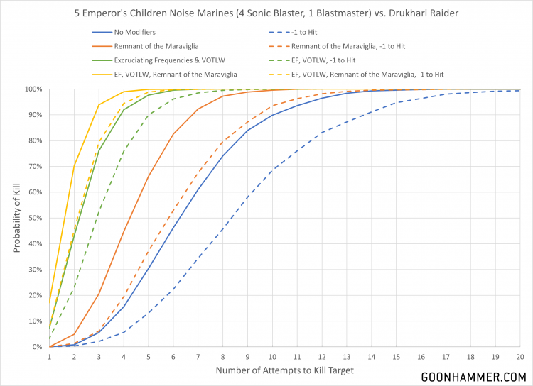 Emperor's Children Noise Marines. Credit: Robert "TheChirurgeon" JonesFirst up we have the very loud (and very awesome) Noise Marines from the Emperor's Children. Wielding sonic blasters and a single blastmaster, a unit of 5 will cost you 110 points. The sweet spot might be closer to 10, where you can field a second blastmaster, but you can fit as many as 20 into a single squad. Noise Marines have access to a lot of fun options to modify their baseline of 12 S4, AP 0, D1 and D6 S4, AP -1, D1 shots. They can use the classic Veterans of the Long War for 1 CP to add 1 to the wound roll, or spend another CP for Excruciating Frequencies to add 1 to the Strength and Damage characteristics of their attacks. Emperor's Children Noise Marines in particular can leverage the incredibly powerful Endless Cacophony for 2 CP to shoot a second time, which is something we'll see play a major role in many of these units. For a particularly crucial attack the Remnant of the Maraviglia can be used once per battle to allow all wound rolls to be re-rolled. As we see in the chart below with the proper unit size and application of Stratagems and support these units can significantly threaten a Raider. Although it takes 3 attempts for 5 models to kill a Raider with the right Stratagems, that's easily viable for a unit of 10 and with a 70% chance of success the application of Endless Cacophony has a pretty good shot of allowing the unit to take down two targets.