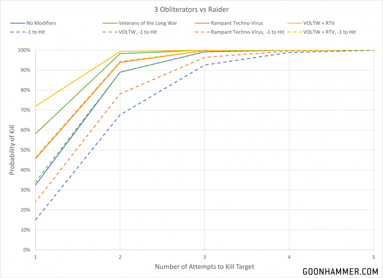 Chaos Space Marines Obliterators. Credits: That GobboContinuing our trend of looking at nasty walking death, we have Obliterators. These hulking monstrosities are well suited for killing Raiders, as the random profile of their fleshmetal guns has no impact on the would roll or invulnerable save. A 315 point unit of 3 of them will get 18 shots hitting on a 3+, wounding on a 3+, and dealing 1D3 points of damage. In addition to being able to use Veterans of the Long War thanks to their INFANTRY keyword, they have access to the Rampant Techno-Virus Stratagem which costs 1CP to allow any D3 rolls to be re-rolled. Given the price 3 of these models are thankfully very good at killing Raiders, with two attempts allowing a very good chance of killing the target.