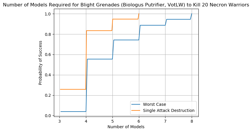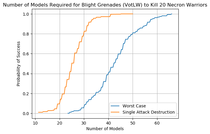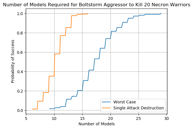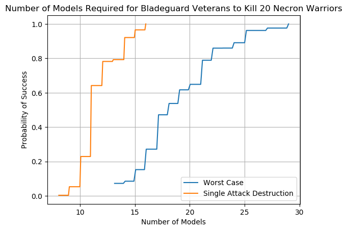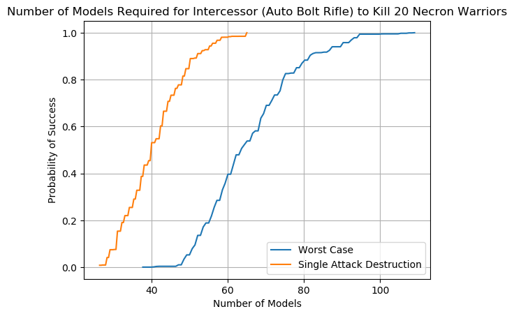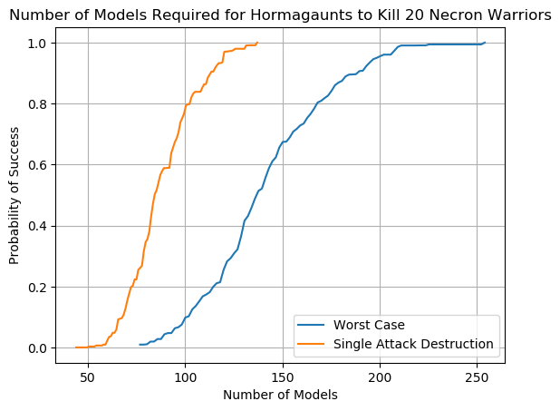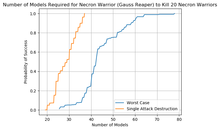 Necron Warriors. Credit: RockfishWith the release of the latest iteration of Codex: Necrons we've seen a dramatic shift in how everybody's favorite Space Undead respond to firepower. The change in Reanimation Protocols from an end-of-turn effect to a constantly revolving resistance to incoming fire has forced players to reconsider what units to field and in what numbers. One of the units seeing the biggest comeback is the lowly Necron Warrior, who thanks to Their Number is Legion are extremely resilient. The way Reanimation Protocols work is that if a unit's attacks does not completely destroy the Necron unit then every wound lost allows the player to roll a d6; every result of 5+ creates a "pool" of wounds that can be used to bring models back. In the case of Necron Warriors with their single wound the effect is basically a super Feel No Pain that ignores excess damage. This also encourages Necron players to field large blocks of Warriors to increase their chances of surviving an attack. With that in mind, exactly how hard are Necron Warriors to kill? In terms of attacks there are two numbers to consider. The first is the probability that a unit's attack will wipe out the block of Warriors, denying them access to RP and guaranteeing they stay dead. The other is the worst case scenario; the maximum number of attacks if the unit is slowly whittled down. By knowing these two numbers we can get a sense of exactly how likely a given unit will be able to destroy the target... eventually.