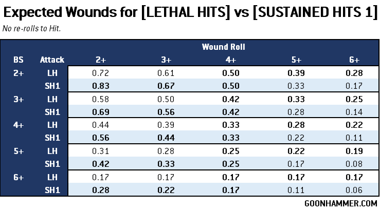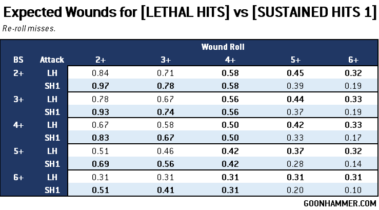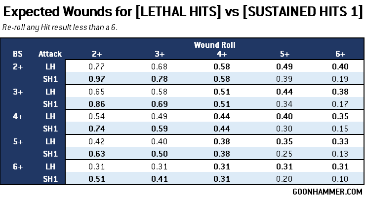 So there you have it. Use [LETHAL HITS] for targets with a Wound roll of 5+ or 6+, and [SUSTAINED HITS 1] for anything else. While technically the expected result is the same for a Wound roll of 4+, [SUSTAINED HITS 1] has a higher ceiling thanks to the chance of getting a second shot. More variance means occasionally you'll get hot. As for re-rolls, unless you're hitting on a 2+ you should only hunt for 6s when the Wound roll is 6+. Otherwise you're better off just re-rolling misses.Thanks for reading! If you have any questions or comments feel free to email us at contact@goonhammer.com. That’s also the best way to suggest topics for future articles.