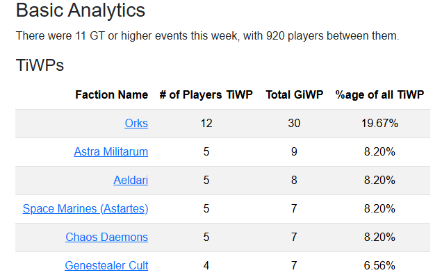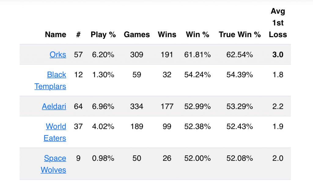 Over the past weekend, 57 players picked up Orks for events with 28+ players and 5+ rounds, and if you remove mirror matches, they won 62.5% of their games. About half of the players going into round 4 with Orks were 3-0 in those events, hence the 3.0 Average First Loss score, which is insanely high. If you restrict that to just More Dakka! Players, it jumps to 3.4, and if you take out the lists which ran Gorka/Morkanauts, their win rate jumps to 71.5%. At the South Coast Super-Major, three of the top four players were running More Dakka!, and the same was true for the Rocky Mountain Open. More Dakka! lists won four events this past weekend - though it's worth noting that adoption rate for the new updates was not yet at 100%. A Taktikal Brigade list was still among the weekends' TiWP lists, for example.