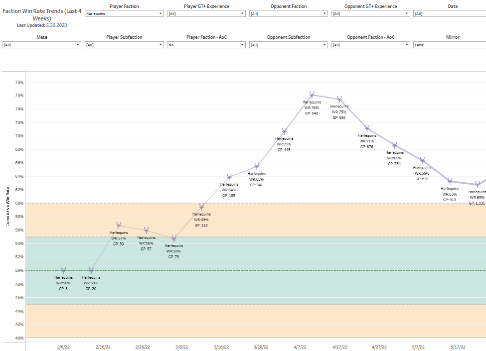 Now let's have a quick chat about the early indicators of army performance. Stat Check looks at much of the same data as Goonhammer, and has sufficient historical data to draw some quick parallels. The army that comes to mind for me when looking at the rapid rise of More Dakka! (yes it's only been 1.5 weekends but the cracks in the meta are showing) is Harlequins at their release in March of 2022 during 9th Edition.