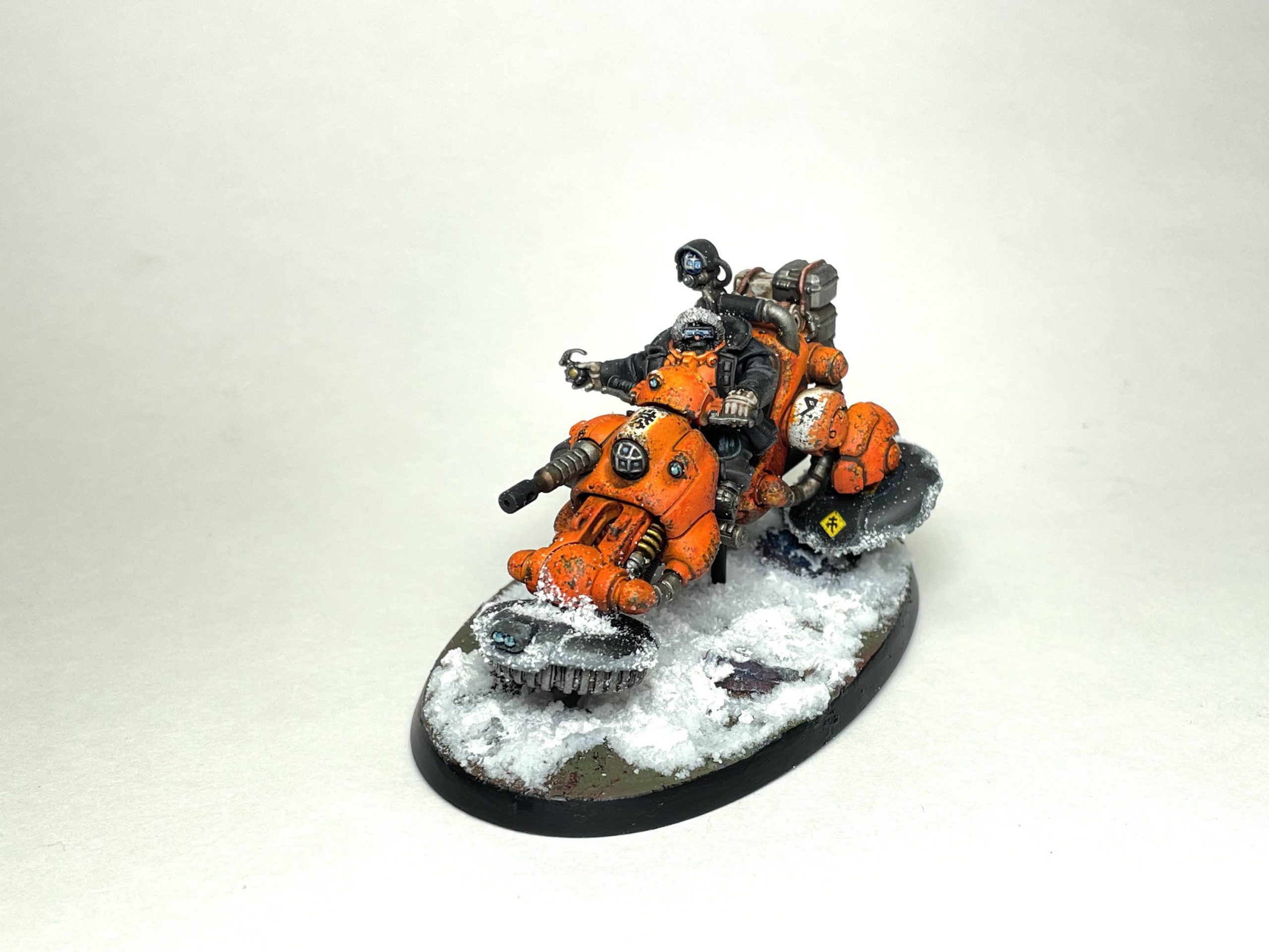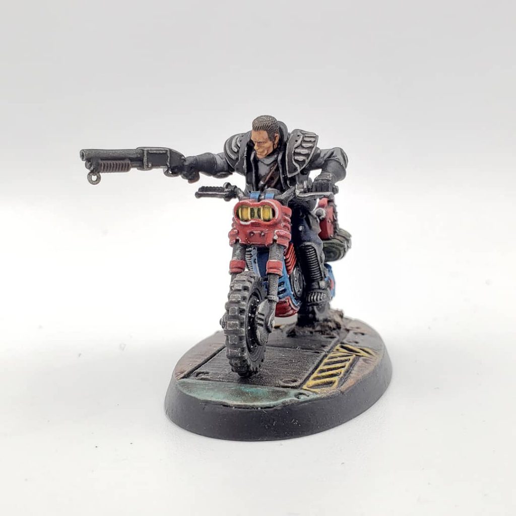 As of this article, all of the items that grant the Mounted condition are considered Wargear. When the Wargear is put on a character's Fighter card they gain the Mounted condition which produces a series of effects. First, the number of weapons they can carry is reduced by one (to typically two) and can't carry any weapon with the Unwieldy trait unless it also has the Lance trait. You can still have bikers firing giant harpoons, but not much else in terms of heavy weapons. Mounted models are also limited to using only one weapon in close combat. Mounted models also can't climb terrain or vehicles (but can go up ramps), and get +2 to their Initiative checks to perform a Retreat (Basic) action.Where things get interesting are two more abilities; Ride By and "I Get Knocked Down..." which cover melee and getting hit respectively. With Ride By a Mounted model can move within 1" of a single enemy model during their movement. If they do so (or move within Long rage of a Versatile weapon), then they can make a single close combat attack. However the target also gets to make a Reaction attack, and after that rules get a bit... odd. If the player is hit by the Reaction attack, the strength of this hit is determined by how fast the model moved. In some cases it's possible that the strength of the hit is less than what it would be otherwise (for example a model going 0-5" takes a S3 hit, even if the attacker is S4). Probably a good thing to houserule.