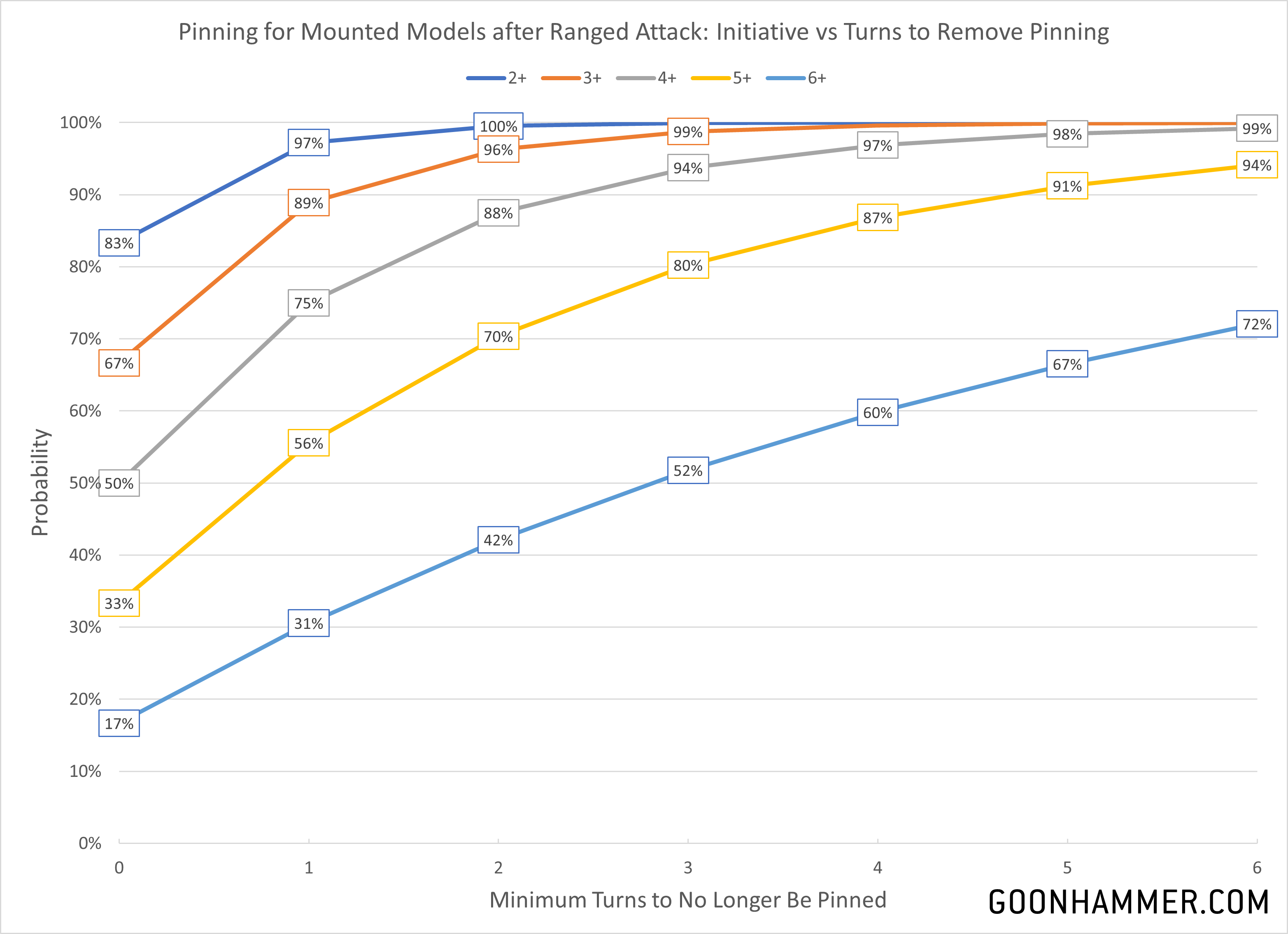 The other major rule is "I Get Knocked Down..." (someone must be a Chumbawamba fan), which covers how Mounted targets react when hit by a ranged attack. Normally a model that's hit by a ranged attack is simply Pinned, but because Mounted units are on racing bikes/jetbikes/bugs they're a little harder to take out. Instead the model takes an Initiative check (with a -1 penalty if the attack has the Blast (X) or Knockback traits). If they fail the check they take a hit with characteristics based on how far they traveled during their last activation, and then they become Prone and Pinned. But wait, there's more. In order to get back up the model has to pass an Initiative check before they can make a Stand Up (Basic) action. If they fail the check, they action is wasted. And since it's a Basic action, they can't try to get up until the next activation. This can be brutal, as seen in the graph below.
