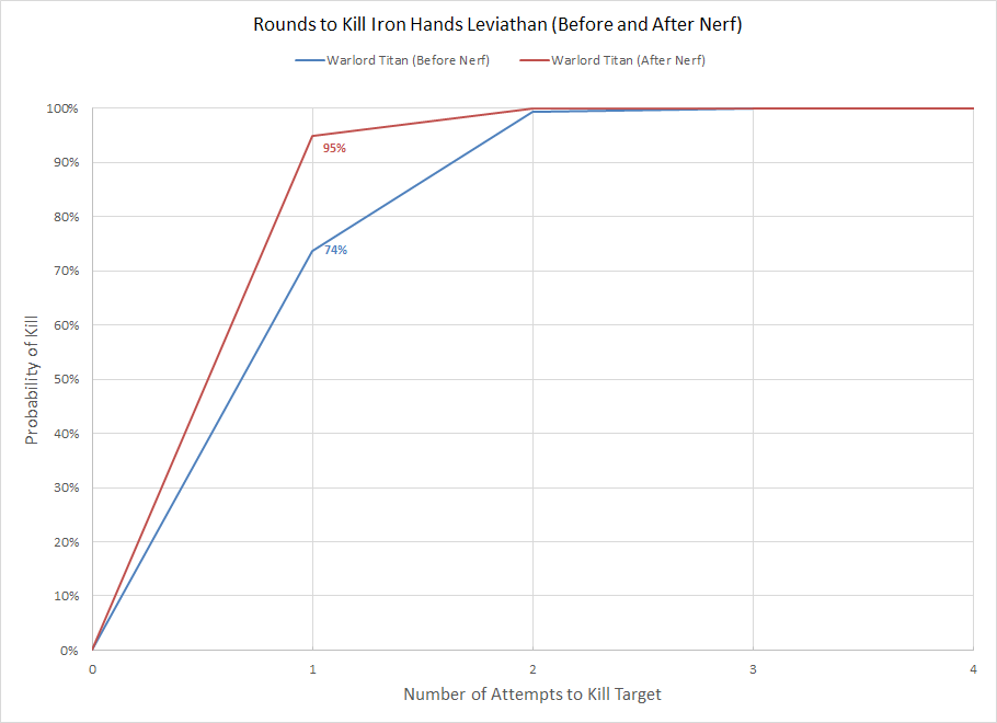So what's wrong? The Warlord Titan seems to suffer from the same misconception that also allowed the Iron Hands to reign supreme for several months. That misconception is the relative importance of the driving values (number of attacks and damage) to the gatekeeping rolls (hit, wound, save, feel no pain). The Warlord Titans are massive, lumbering constructs that are entirely dependent on the high variance associated with the number of shots. It's entirely possible for a 6000 point unit to only fire 8 shots in an entire turn. Whatever the number, 30% of those shots are likely to either miss or fail to wound, as Titans don't get re-rolls and a result of 1 always fails. And in the case of the Bellicosa and Reaver Laser Blaster if there's an invulnerable save the target will have a chance to use it whether it's a Knight or a particularly lucky grot. Numbers matter, and a 6000 point war machine should be a threat to 6000 points worth of models. Hopefully Games Workshop will correct that when they address the Forge World units in the near future.