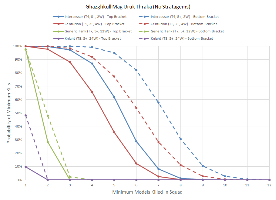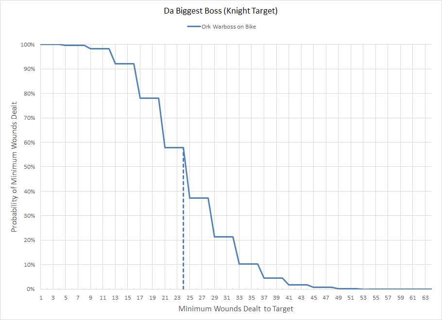 Pretty good. A 58% chance to kill a Knight in one turn is a pretty serious threat, and the Ork does it with a reliable source of fixed damage that helps significantly with reducing variability. Historically Orks have been the victim of high variability, with random attacks and damage rolls causing wild and unreliable swings in their output. It's one of the reasons that Deathskulls are so popular. In this case we see a large number of attacks merged with re-rolls to hit and would that nullify most of the gatekeeping rolls, resulting in a pretty nasty combination. It's also why Ghaz isn't as lethal as he could be; without the re-rolls to wounds and one less attack he just doesn't have the offensive firepower that other options have.