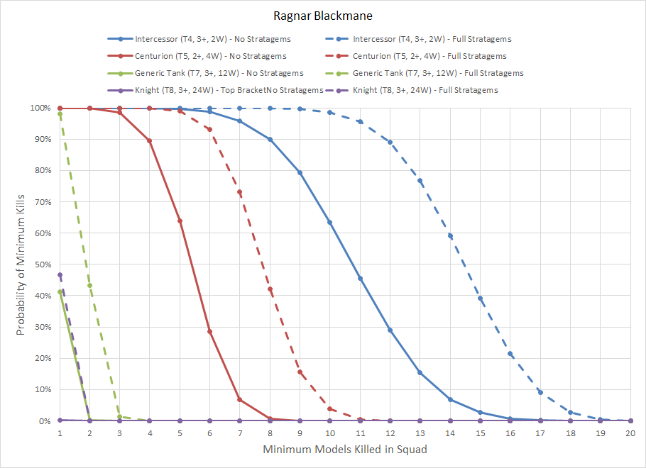 For the analysis above I assumed the Assault Doctrine and applied Seeking a Saga to every target, but as usual I did not use a fight twice Stratagem. Using Ragnar Blackmane against a squad of 5 Intercessors is one of the most egregious displays of overkill imaginable, so kudos to you for doing it. Fully charged Ragnar is an absolute monster, with a high probability of wiping out nearly anything he comes in contact with. Against a fully boosted Ragnar full squads of Intercessors, Centurions, and Tanks are nearly guaranteed to disappear. Even a Knight is vulnerable, thanks to the combination of a massive number of attacks, re-rolling wounds, -4 AP, and the guarantee of two points of damage every time a six is roll to hit. Things get even more terrifying if you bring along a Wolf Priest who can perform Tale of the Wolf King and the Lord of the Deeps to add +1 damage, but that requires Ragnar to be on the board and therefore unable to deep strike.