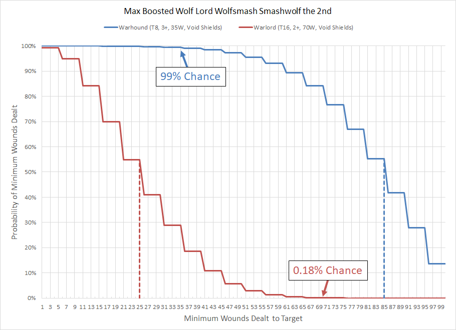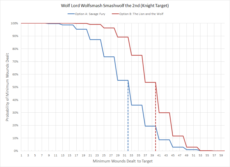 Congratulations; you've just found the most devastating Smash Captain in the game. The reason here is simple; Touch of the Wild gives an INCREDIBLE boost and effectively increases the number of attacks by 50%. On Ragnar it's scary; on a Smash Captain with a thunder hammer that deals 4 damage with every strike it's terrifying. It has a 99% CHANCE OF KILLING A KNIGHT IN ONE TURN, making it more lethal than even a Bloodthirster of Insensate Rage. Even without The Lion and the Wolf the Wolf Lord is brutal, with an 87% chance of one-shotting a Knight. And neither one of these choices includes the application of a Stratagem to make them fight twice.