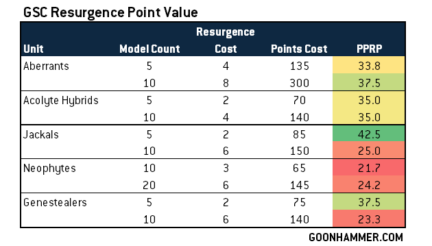That said, not all units are created equal when it comes to Resurgence Points, and if we look at the RP cost vs. Points costs of specific units, we can see this at work. When it comes getting the most out of your Resurgence Points, large units of Aberrants, 5-model units of Purestrain Genestealers and 5-model units of Atlan Jackals provide the most bang for your buck. Jackals are particularly good in this regard, netting you a whopping 42.5 points per Resurgence Point spent. The worst value? ten-mane units of Neophyte Hybrids.
