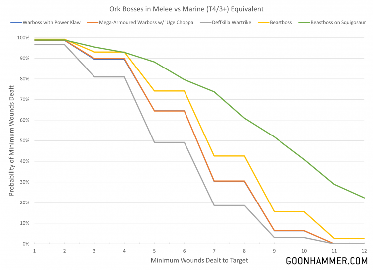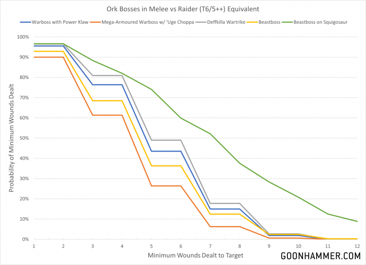 Credit: Charlie BrassleyFirst up we'll look at the relative effectiveness of Ork characters, courtesy of a request from Trout. There's only one problem; there's roughly ten thousand different Ork characters in this book and all of them have different profiles. Want to kill everything? Take Ghaz. Want to eat everything? Take Skragbad. I'll save a deep dive for a future article, but to start I'll compare the Warboss with power klaw, Mega-Armoured Warboss, Deffkilla Wartrike, and Beastboss on Squigosaur against a selection of targets. Ork Warbosses are characterized with a baseline of 5 attacks, typically hitting at S7 to S12 depending on the weapon, hitting on a 2+ and dealing 2 damage behind an AP of -2 or -3. The new Beastboss units come in either a foot unit that hits very similarly to the previous models, or a Beastboss on Squigosaur option which gets an additional 3 attacks which can deal 3 mortal wounds on wound roll of 6.