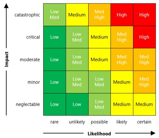 The second part of risk management is understanding the consequences of a particular failure and converting that into a level of impact. The difference between a single plasma gunner Guardsman dying at the end of the game and a Space Marine Captain with a plasma pistol dying in the first turn are very different. In broad terms a catastrophic consequence would be one that's guaranteed to lose the game, a moderate consequence might be one that would be a challenge to recover from or would significantly limit your options, while a neglectable consequence would be one that is completely inconsequential (such as long a unit that isn't scoring points at the end of the game). Once you understand the probability and impact of a particular action, you can then apply a rubric such as the matrix below to determine how risky a particular action is, and determine the level of reward needed to justify the risk.