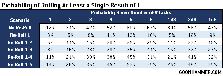 In the context of overheating a plasma weapon the probability of failure is easily determined; it's the probability that an unmodified 1 will result. The probability of that happening depends on the presence of a re-roll, how often a hit die will be re-rolled based on the target number, and the number of attacks. Note that all we really care about is that not a single result ends up being a 1, meaning that we have a 5 in 6 chance of success. To determine the probability based on the number of outcomes take the initial probability, raise it to the power of the number of attacks performed, and then subtract that number from one. For example an assault plasma incinerator gets three shots, so the probability of not rolling a single result of one is (5/6)^3 or 58%. Therefore the probability of rolling at least a single result of one is 1 minus that, or 42%.