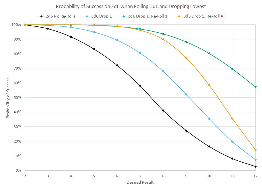 The Seeker After Shadows Warlord Trait grant the Warlord two abilities. First, every time your Warlord attempts a Psychic Action you roll one addition D6 and discard one of your choice. The second is that the unit generates an additional Cabal point. The effect of getting to roll 3D6 and drop 1 is shown below, along with a few notable re-rolls. Note that when combined with Glimpse of Eternity and Brotherhood of Sorcerors a Warlord with Seeker After Shadows could hit an 11+ result 70% of the time. While this effect is of limited utility when it comes to psychic actions, which typically have a low WC, it could come in handy for the Mutate Landscape psychic action, or if you're worried about being denied by Grey Knights or some other cheeky opposing psyker.