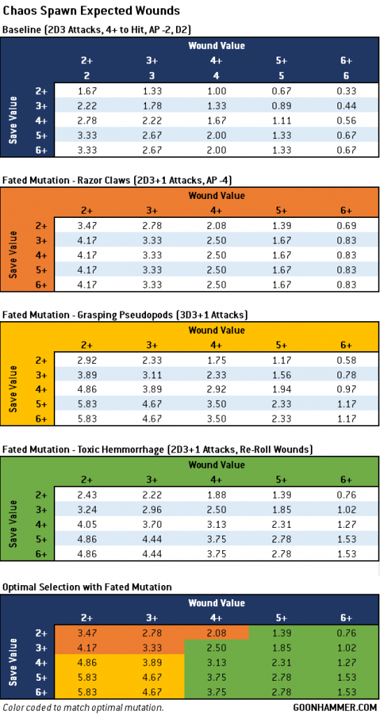 Reader Pasch submitted an interesting question via our submission form. They want to know which mutation is preferred when you apply Fated Mutation for 1 CP, which allows you to choose a mutation for a unit of Chaos Spawn instead of roll for it. You also happen to get a bonus attack for each model, which is handy. Chaos Spawn are absurdly cheap Fast Attack units which exist solely to run into things are murder them. At 23 points these T5 critters with four wounds get 2D3 attacks at S5, AP -2, and D2. They have three mutations. Razor Claws changes their melee attack to AP -4. Grasping Pseudopods changes their attacks from 2D3 to 3D3. Toxic Hemmorhage allows them to re-roll failed wounds. Because we're dealing with a wide range of save and wound targets the easiest approach is to calculate the expected wounds for each combination and see which solution is optimal. The results below assume that you're using the Stratagem to induce an effect and therefore will also gain an extra attack. We quickly see that all three effects have their place. The razor claws are most useful against targets of T5 or lower with saves of 2+ or 3+, the grasping pseudopods more effective targets of T5 or lower with higher saves, and the toxic hemorrhage is preferable against the tougher stuff.