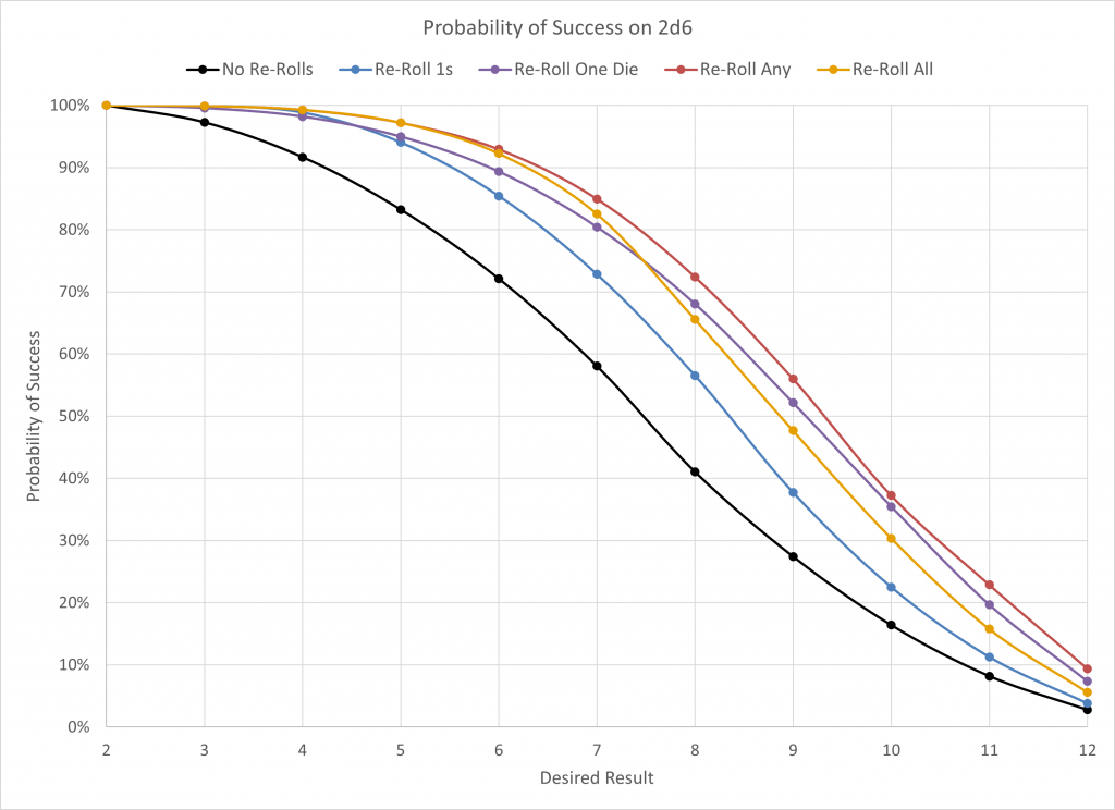 With the Brotherhood of Sorcerers rule every unit in the detachment gets a +1 to Psychic Tests, which is a significant bonus given how many tests a Thousand Sons player intends to make. The chart below shows the probability of a Psyker Test given all of the possible re-roll conditions, most of which are available to the Thousand Sons. To apply BoS to the chart below simply shift the desired result by one (so for a power with a warp charge of 6 your desired result is 5). Later on the article we cover the effect of abilities like Seeker After Shadows which allows you to roll an extra D6 for Psychic Actions before discarding one.