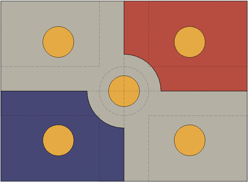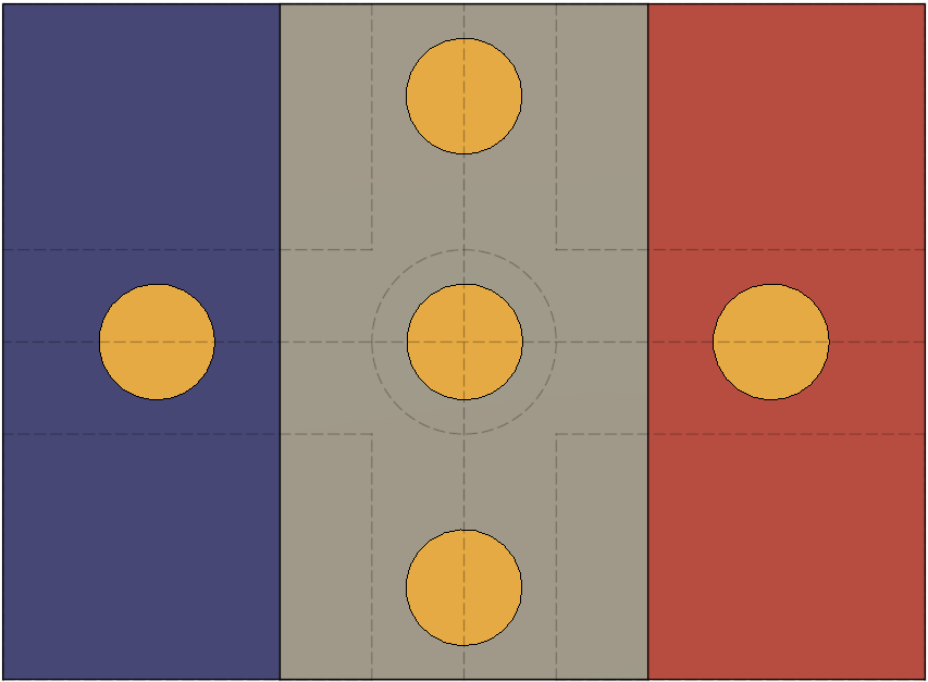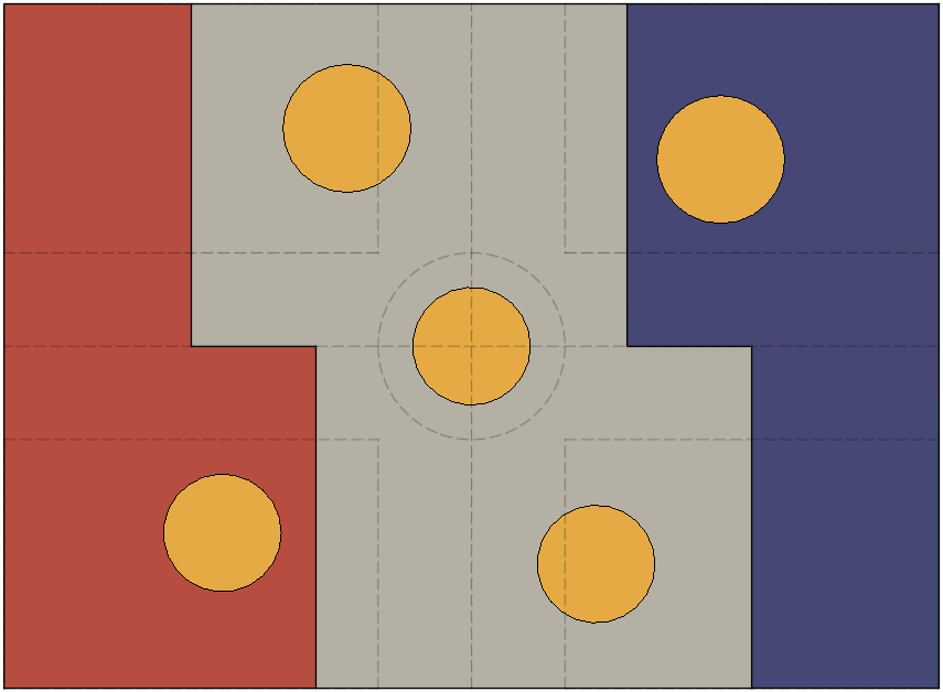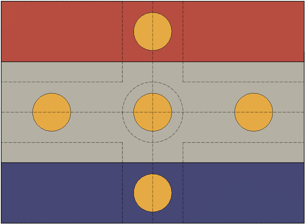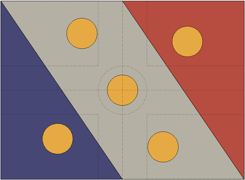 The dashed lines in the pictures below represent areas of interest for various Secondary Missions. The circle in the center has a radius of 6", while the straight lines show the true table quarters as well as the area representing 6" away from the other quarters.
