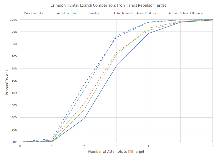 With the prevalence of Repulsors (especially Iron Hands) and flyers in the current competitive meta it may be worth locking in the choice of Aerial Predator. Although this reduces your effectiveness against ground targets, the +1 damage bonus is superior to even Hawkeye. I also added two curves showing the benefits of adding a re-roll hit of 1 effect such as from an Autarch; in a re-roll bubble two Crimson Hunter Exarchs have a roughly 50% chance of killing an Iron Hands Repulsor if they have Aerial Predator.