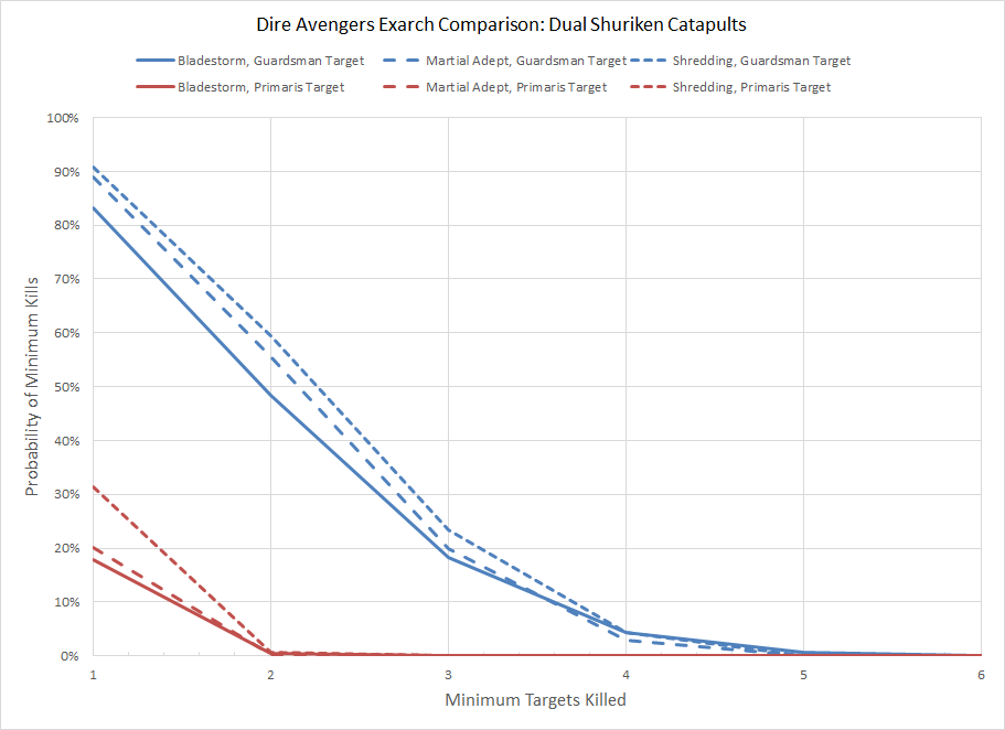 The bottom line is that from a mathematical standpoint Avenging Strikes has a 54% greater output than Bladestorm, but with the caveat that you must lose a model before this occurs. Depending on the size of the unit and the threat Avenging Strikes may never be used as the unit could be wiped out (particularly a concern for smaller units). The circumstances revolving around which option is ultimately superior depends on your style of play, the threats encountered, and the size of the unit. A larger unit which is able to withstand casualties is a more appropriate choice for Avenging Strikes, but a 54% output is significant. As is the case with all modifiers any situation with a lower P(Wound) or lower P(Save) is going to see that effect improve even further.