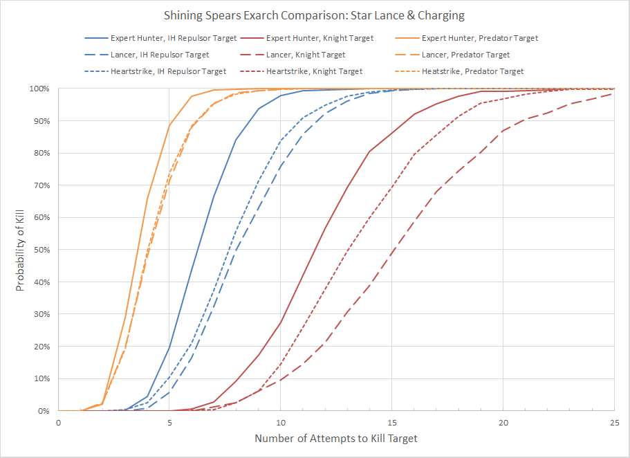 In the graph above each color represents a different target, and the dashed line and solid line are different abilities. The further to the left a curve is the better, indicating that the unit is able to kill the target faster. We already know that modifiers are better than single die re-rolls, and nothing changes here. Under the rules of 8th Edition getting a +1 to hit will always be better than re-rolling values of 1, and since Crimson Hunters will always be moving choosing Hawkeye is the superior choice.