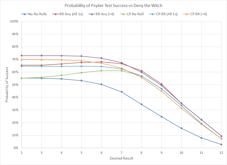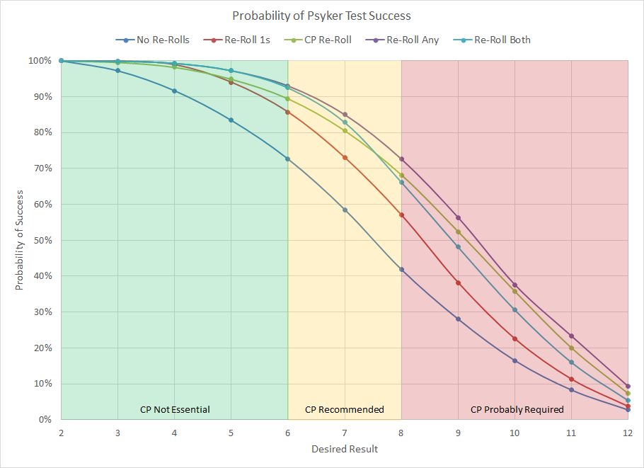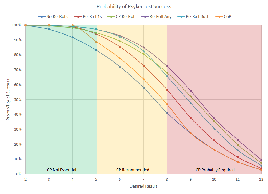 Probability distribution for Psychic tests for various scenarios.When two dice are rolled and added together the most likely result is 7 (58% of the time), so as you can expect the curve shifts drastically around that point. For lower warp charge powers with values of 6 or below you have a very good chance of success without needing a command point. On the other hand powers with a warp charge of 8 or greater have a sufficiently low chance of success that it is likely in your best interest to keep a command point in reserve should it be a crucial power. It's important to understand the rules surrounding re-rolls. In addition to never being allowed to re-roll any die more than once, per the latest FAQ you must declare all re-rolls simultaneously. As an example, you're not allowed to use Runes of the Farseer or Knowledge is Power to re-roll one die and then apply a Command Point to re-roll the other die based on the result.