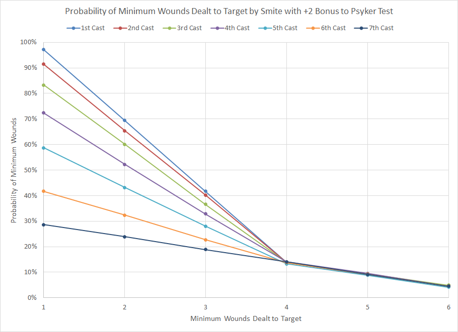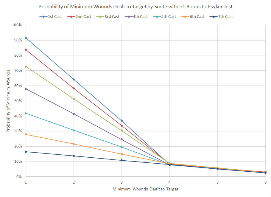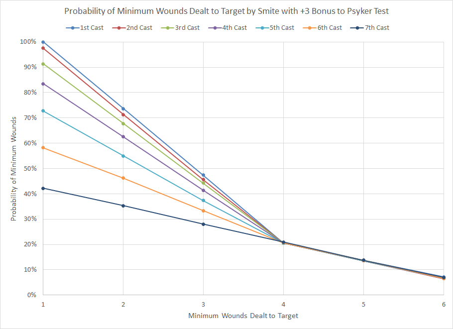 Probability distribution for minimum wounds dealt by Smite power for sequential castings and a +3 bonus.As expected the bonuses provide a significant improvement in the probability of success, improving both the probability of successive castings as well as the damage dealt. The fourth casting with a +3 bonus has an equivalent chance of success to the first casting of an unmodified roll while also improving the chances of dealing 4 or more wounds from 5% to 20%. This effect will also apply to any other power which has superior results with higher Psyker tests results, such as Cacophonic Choir from the Slaanesh Daemon discipline or Trephination from the Dark Angel's Interromancy discipline.
