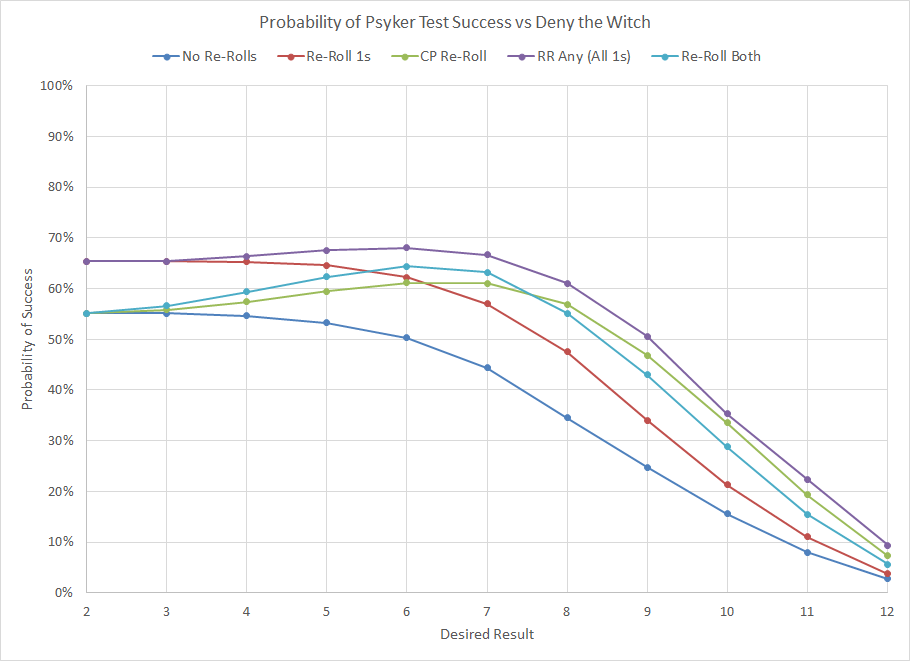 Probability distribution for Psychic tests against Deny the Witch for various scenarios.The curves above show the probability of success for a contested Psyker test under a variety of conditions. The influence of Deny the Witch is significant for all warp charge values of less than 10, reducing the probability of success for all unmodified Psyker tests to a maximum of 55%. The ability to re-roll values of 1 is particularly important, as it has a significant chance of improving the outcome and preventing a denial with no penalty to the Psyker. The slight increase in the purple line (re-roll any dice including all 1s) in the middle warp charge values can be attributed to the strategy used. For that particular condition I assumed that the player would use the same strategy as in the previous chart and only re-roll values below 4 if the Psychic test was a failure, but that they would also re-roll all values of 1 since there's no penalty. This means that in situations where the player had a low warp charge they may not necessarily re-roll any dice but still have a low value.