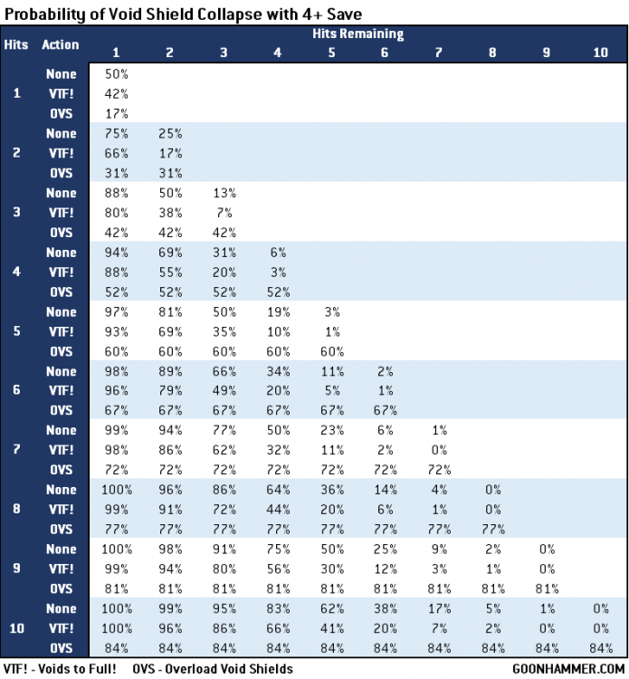 - Alternatively when attacked a player can declare Overload Void Shields to resolves all saves at 2+, but if any save fails then the shields collapse and cannot be reignited.