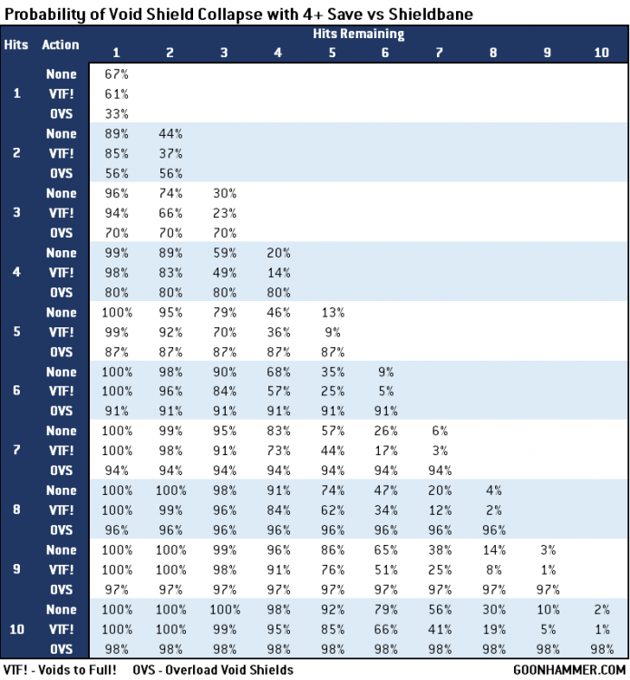 To use the chart, start with the save of your Titan and whether or not the attack has Shieldbane. From there look at the row that indicates the number of hits received, determine what action (if any) you want to take, and look at the column showing the number of shields remaining. For example my undamaged Warlord Titan (3+ save) just received 8 hits from an enemy Warlord's missile launcher. The Warlord can take 5 hits before the shields collapse, so from the chart I see that if I do nothing there's a 9% chance that my shields will drop. If I use Voids to Full! that chance of failure drops to 2%. If I use Overload Void Shields the probability jumps to 96% because if there's at least one failure then the shields burn out. I can also use this chart to predict how likely it is that I will drop from 3+ to 4+; a Warlord Titan can take 3 hits before the Void Shields drop in strength and given 8 attacks that has a 53% chance of happening normally or a 25% chance if I push the reactor and re-roll Save rolls of 1.