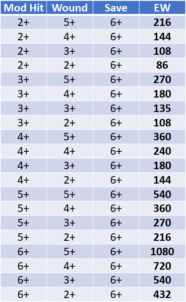 If the requirement is to kill 300 Gants in six turns then the attacking army needs to reliably deal 50 wounds. Put that number into the above equation along with various hits, wounds, and save values and you get the number of attacks required which is provided in the helpful chart below:
