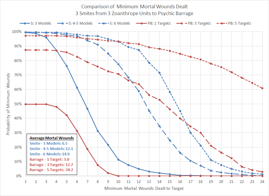 The blue curves represent the output of Smite for 3 units of Zoanthropes consisting of 3, 4-5, and 6 models. The red curves show the output of Psychic Barrage against 1, 3, and 5 targets within the 6" diameter circle that can be affected. As one can imagine the efficacy of the Stratagem increases significantly as more targets are within the area of effect; if you can force your opponent to have three units within 3" of the same point then on average the output will exceed three Smites from a unit of 4-5 Zoanthropes. The Stratagem also has the advantage of not requiring that the target be the closest target, which poses a challenge for using Smite. On average Psychic Barrage will deal more mortal wounds than Smite against 2 targets if the Zoanthrope unit size is 3, 3 targets if the unit size is 4-5, and 4 targets if the unit size is 6. Whether or not the player wants to make the investment of 9-18 Zoanthropes is up for debate, but in the right circumstances the effect can certainly be devastating.