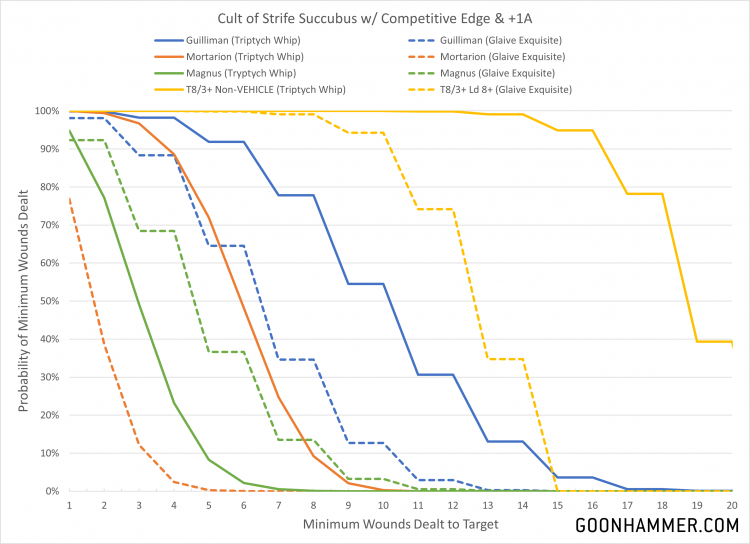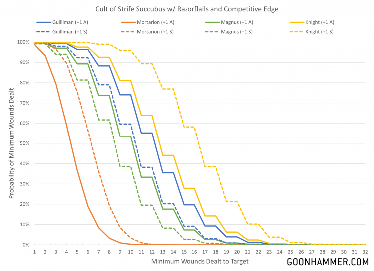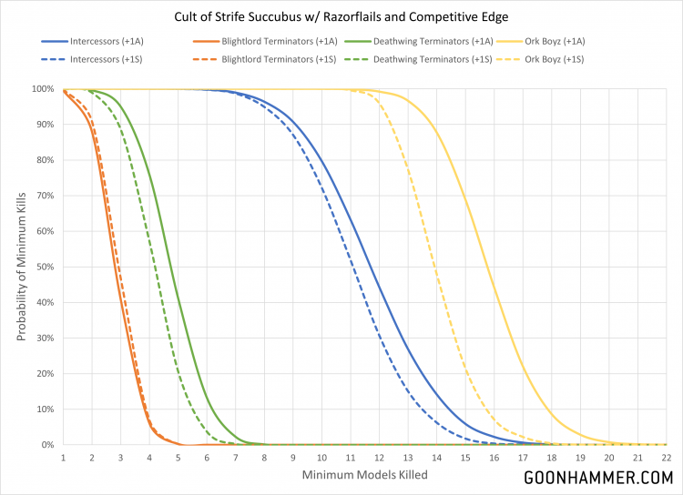 Drukhari Raiders. Credit: John IndellicateOne of my favorite things to write in Hammer of Math is about the more absurd combinations that result in dramatically out-of-balance effects. Whether it's the amazing durability of the fabled Iron Hands Leviathan or the incredible offensive firepower of Wolf Lord Wolfsmash Smashwolf the 2nd who had a 99% chance of killing a Knight in a single turn, sometimes things just synergize in hilarious ways. This week we have another potential combination, courtesy of the new Codex: Drukhari and the supplemental rules of War Zone Charadon: The Book of Rust. The particular arrangement uses a Succubus equipped with Razorflails and the Competitive Edge. The Succubus starts with 6 attacks at WS 2+ and S3. Selecting Adrenalight for your Combat Drugs ability makes that 7 attacks. Blade Artists makes every unmodified wound roll of 6 improve AP by 1. Razorflails have a baseline value of Strength: User, AP -1, and deal 1 point of damage but the player makes 2 hit rolls for every attack instead of 1.
