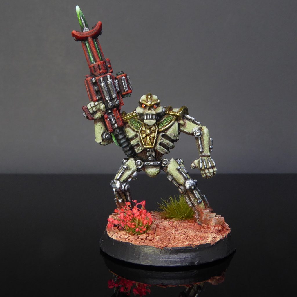 A Necron Warrior of the Sarnekh Dynasty by Craig "MasterSlowPoke" SniffenAs the space undead equivalent to the Eldar's space elves, the Space Marines' space knights, and the Orks'... space orcs, one of the defining characteristics of the Necrons has been the ability to return from destruction. In 8th Edition the method was straightforward but cumbersome; at the beginning of every turn you rolled a d6 for every model in a unit that was destroyed. On a 5+ the model was returned to the unit with a full complement of wounds. If the unit had been wiped out then there was no opportunity to roll, but so long as the unit existed every model that hadn't fled had the potential to come back. In 9th Edition the rules are drastically different: