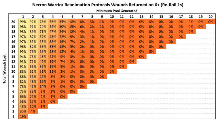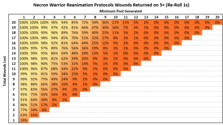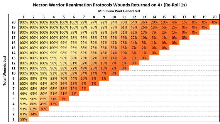 Necron Warriors have a bonus rule called Their Number is Legion which allows for a universal re-roll of results of one on Reanimation Protocol rolls. This means that 17% of the time the dice will be re-rolled which converts the individual probability to 58% for a 4+, 39% for a 5+, and 19% for a 6+. Unlike Protocols of the Undying Legion, this effect is universal and works in every turn for every roll.