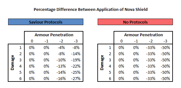 The AP -2 and AP -3 columns are superfluous thanks to the 3+ invulnerable save, but they're included for the sake of consistency (and because I already had the chart formatted for four columns). The AP 0 and AP -1 column are unchanged from the previous chart. When Saviour Protocols is available the primary benefit of Nova Shield is against AP -2 or better weapons which can be applied to the 3+ invulnerable save and have an increased chance of mitigating damage.