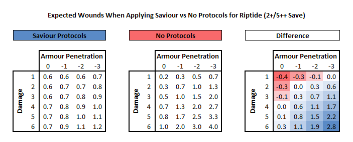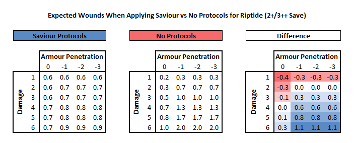 The chart above compares the expected wounds for a Riptide that is not under Nova Shield. The columns are armour penetration; the Riptide has a 5++ so any value of -4 or lower is irrelevant. If the Riptide is in cover then simply shift the AP value to the left. The rows are for potential damage values; against weapons with variable damage (1d6, 1d3, etc) use the expected value based on the die roll. The expected value for 1d3 roll is 2, and the expected value for a 1d6 roll is 3.5. The colored chart on the right indicates which result is optimal; since Shield Drones are less valuable than Riptides in the event of an even (white) reading the optimal solution is to apply Protocols and risk killing a drone. For 1 damage weapons the Riptide save is preferable up until the result is a 5+. Things get more interesting on multiple-damage weapons with no AP (either because they're AP 0 or AP -1 against cover). From a raw mathematical perspective the improved save of the Riptide makes it an optimal choice even against weapons that deal 2 or 3 damage. According to the math, by using Saviour Protocols you will eventually take more wounds in the form of dead drones than you would take wounds on the Riptide.