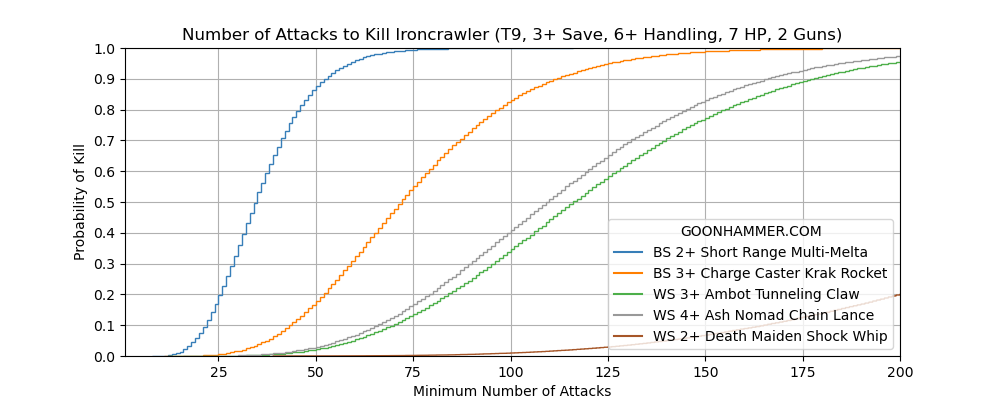 I took the script that I previously used for ranged attacks and modified it to incorporate the order of operations listed above. I looked at five different weapon profiles; two ranged (a best case scenario melta attack and the Nomad Charge Caster) and three melee options (Ambot, Ash Nomad Chain Lance, and a Death Maiden Shock Whip). I put those results up against a variety of targets.