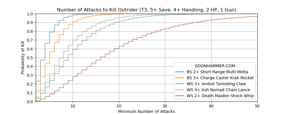 The Mauler is somewhere between a light and a medium target, which is amusing when you consider that it's basically a guy on a large treaded bike. As before the shock whip is largely ornamental, needing over 30 attacks before it has a better than even chance of destroying the Mauler. The melee options all remain significantly less viable than the charge caster, let alone the multi-melta. The takeaway here is that a relatively weak vehicle like a Mauler is exceptionally hard to kill, regardless of the method used.