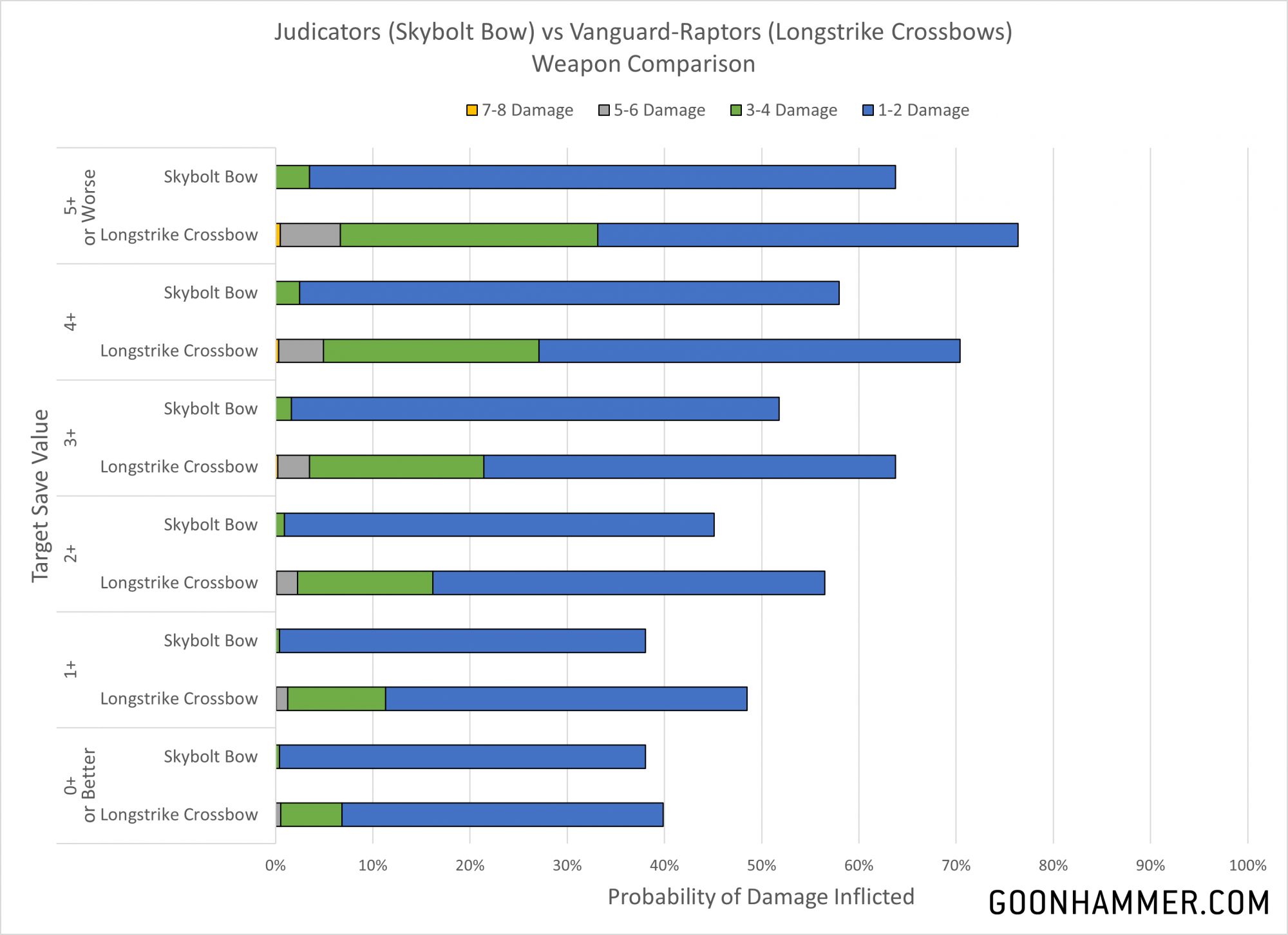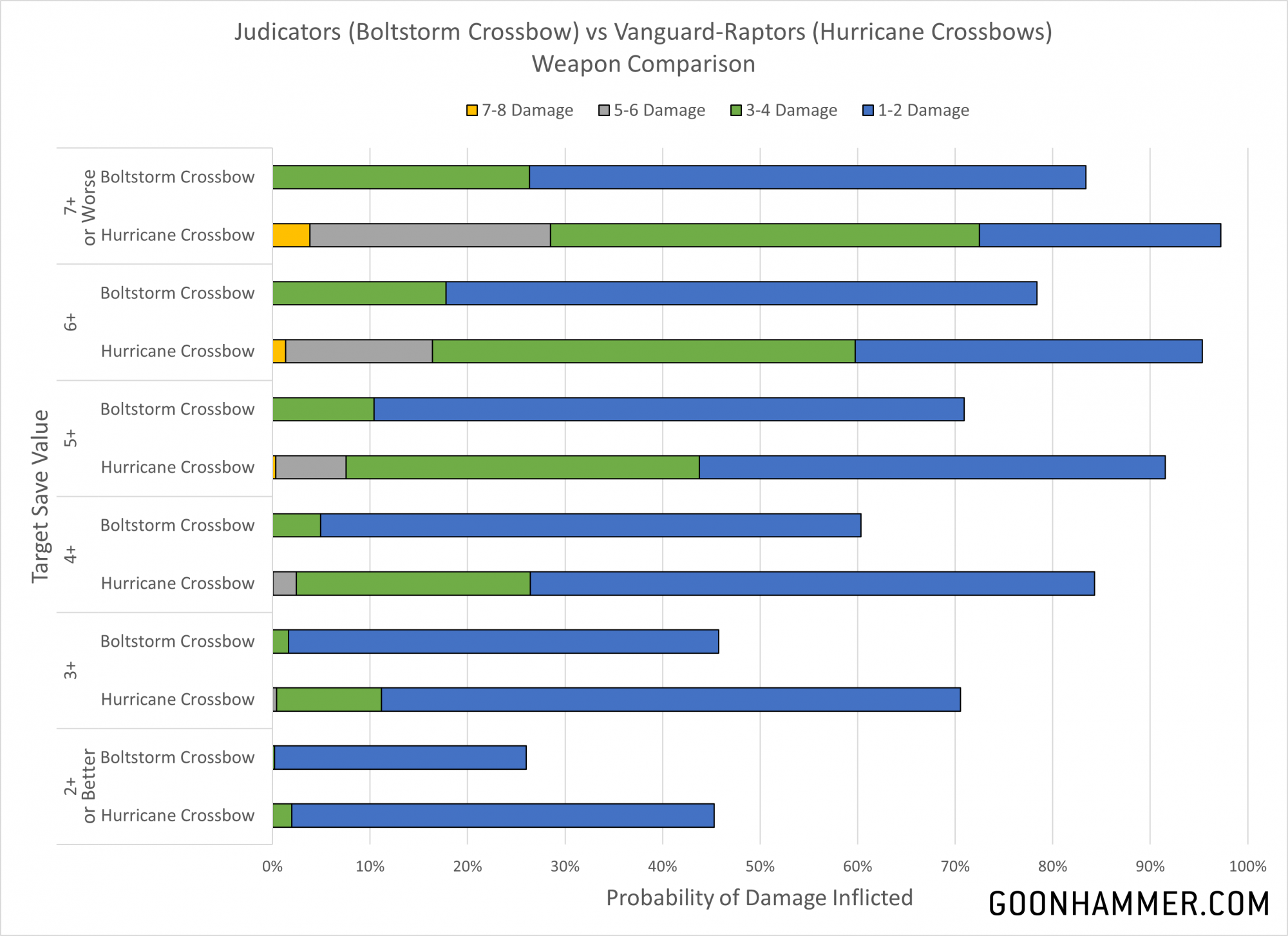 At short range we see that the added attacks of the Hurricane Crossbow make it significantly better than the Boltstorm Crossbow across the entire range of threats. In fact the Hurricane Crossbow is twice as effective, which makes sense given that the only difference between the two profiles is that the Vanguard-Raptor version gets twice as many attacks.