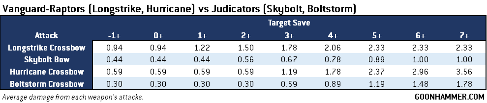 This is an example of where the averages are more useful than the spread. We see that the Longstrike Crossbow is the superior option until the target has a 5+ or worse armor save, at which point the Hurricane Crossbow's extra attacks is the superior choice. We also see that the Vanguard-Raptor option is always double (or better) than the Judicator option and in the case of the Longstrike against particularly well armored targets the difference is closer to triple the wounds dealt.