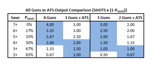 The results show that for Commanders, Advanced Targeting System is inferior against saves of 5+ or worse, a wash against saves of 4+, and superior to a fourth gun against saves of 2+ or 3+. Note that those saves are not the original save of the target, but the modified save after Armor Penetration. For XV8 Crisis Battlesuits the only benefit is against 2+ saves. There is no scenario in which you would want to use ATS on plasma rifles or fusion blasters. Against power armor it would be worth considering for the airbursting fragmentation projector, burst cannon, cyclic ion blaster, flamer, and missile pod. It is also cheaper than any weapon the flamer, which it is equal to. The ATS is an optimal choice for targets with a 4+ (Commander) or 3+ (XV8) save or better after the weapon's armor penetration is applied (not including the ATS).