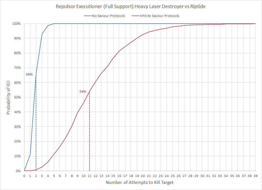 Saviour Protocols reduced the average number of wounds dealt per turn from 8.1 to 1.3, an 83% reduction in output. Now obviously this scenario requires a little suspension of disbelief in the form of infinite Drones, but the chart makes it painfully clear how much of an absolute pain in the ass Saviour Protocols can be if the player is not prepared for them. The Riptide could be even more difficult to kill if it gave itself a 3+ invulnerable save, but that comes at the expense of being able to shoot less, and the best defense is a good offense. In competitive play this means incorporating some means of targeting a model that's relatively weak, almost certainly out of line of sight, and extremely resilient (the combination of 4+ invulnerable save and 5+ Feel No Pain effectively triples the number of attacks required to kill a Shield Drone). There are a variety of options for doing this.