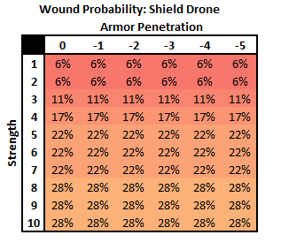 Rather than explore the impact of these weapons individually, it's easier to look at the entire spectrum as a function of strength and armor penetration. The wound chart below does just that, looking at the full spectrum of potential threats. The ideal anti-drone weapon fires a lot of shots, a high strength (ideally at least 5), and either a -1 AP or the ability to ignore cover. While the Drones do not have the INFANTRY keyword they will still be fully obscured and therefore benefit from cover. It's in the T'au's player best interest to find these weapons and eliminate them, while opposing players will find their lives to be significantly more difficult if they lack weapons which can do this. Notably the Thunderfire Cannon is extremely good at this task as it gets 4d3 shots at S5 that ignore cover. The Whirlwind, while nasty with 2d6 S6 shots, does not ignore cover so make sure your Drones are getting that 3+ save if your opponent isn't in the Devastator doctrine.