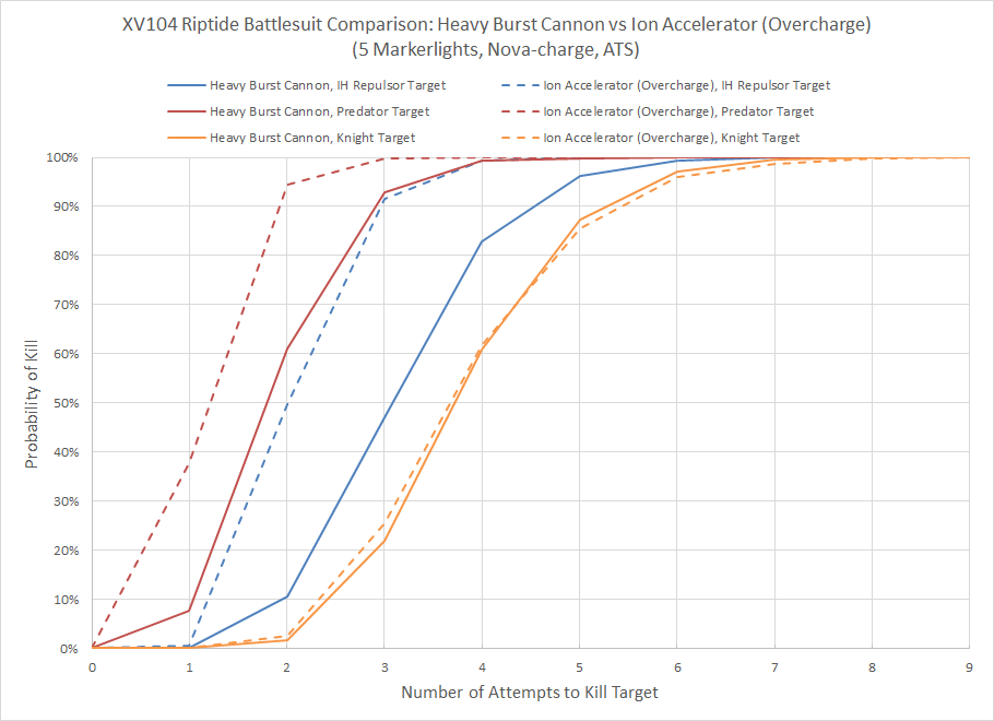 In spite of the extra shots, the combination of higher strength, armor penetration, and damage give a roughly 30-40% edge for the overcharged ion accelerator against the Predator and Repulsor targets. Where the heavy burst cannon has an advantage is against the Knight, which has an invulnerable save that nullifies the additional armor penetration. The heavy burst cannon also has significantly more utility against anything with a toughness of 6 or lower. It absolutely mulches Primaris Marines.